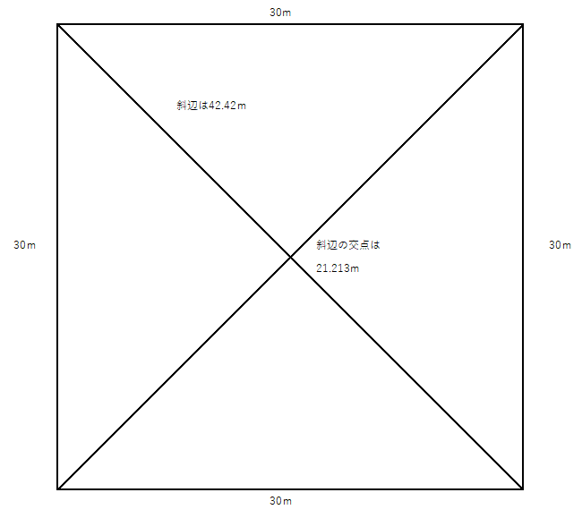 つまり、30m・30m・42.42mです。それを1つの底辺に対して2つ描き、それぞれの頂点をさらに結ぶとこのような図形が描けます。