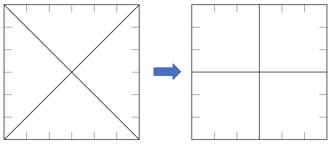この段取りを省略して最初からセンターラインを入れた「田」の字をつくろうとしても直角が正確に描きにくいですし、おそらくこの方法が最速ではないかと思います。慣れてくると、上記1、2、3の手順をほぼ同時に展開できます。