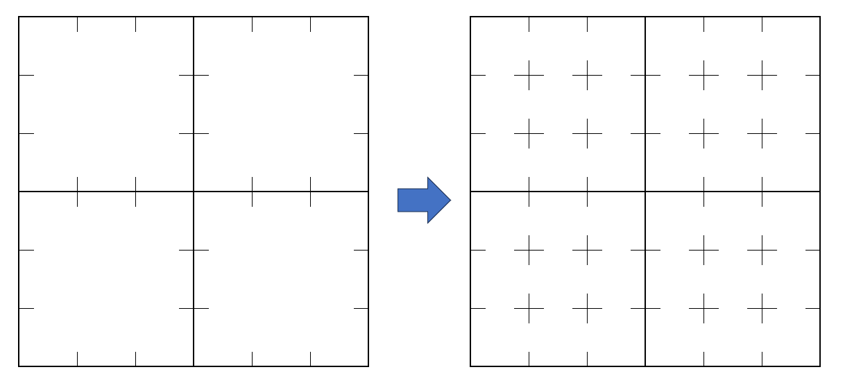 この段取りを省略して最初からセンターラインを入れた「田」の字をつくろうとしても直角が正確に描きにくいですし、おそらくこの方法が最速ではないかと思います。慣れてくると、上記1、2、3の手順をほぼ同時に展開できます。